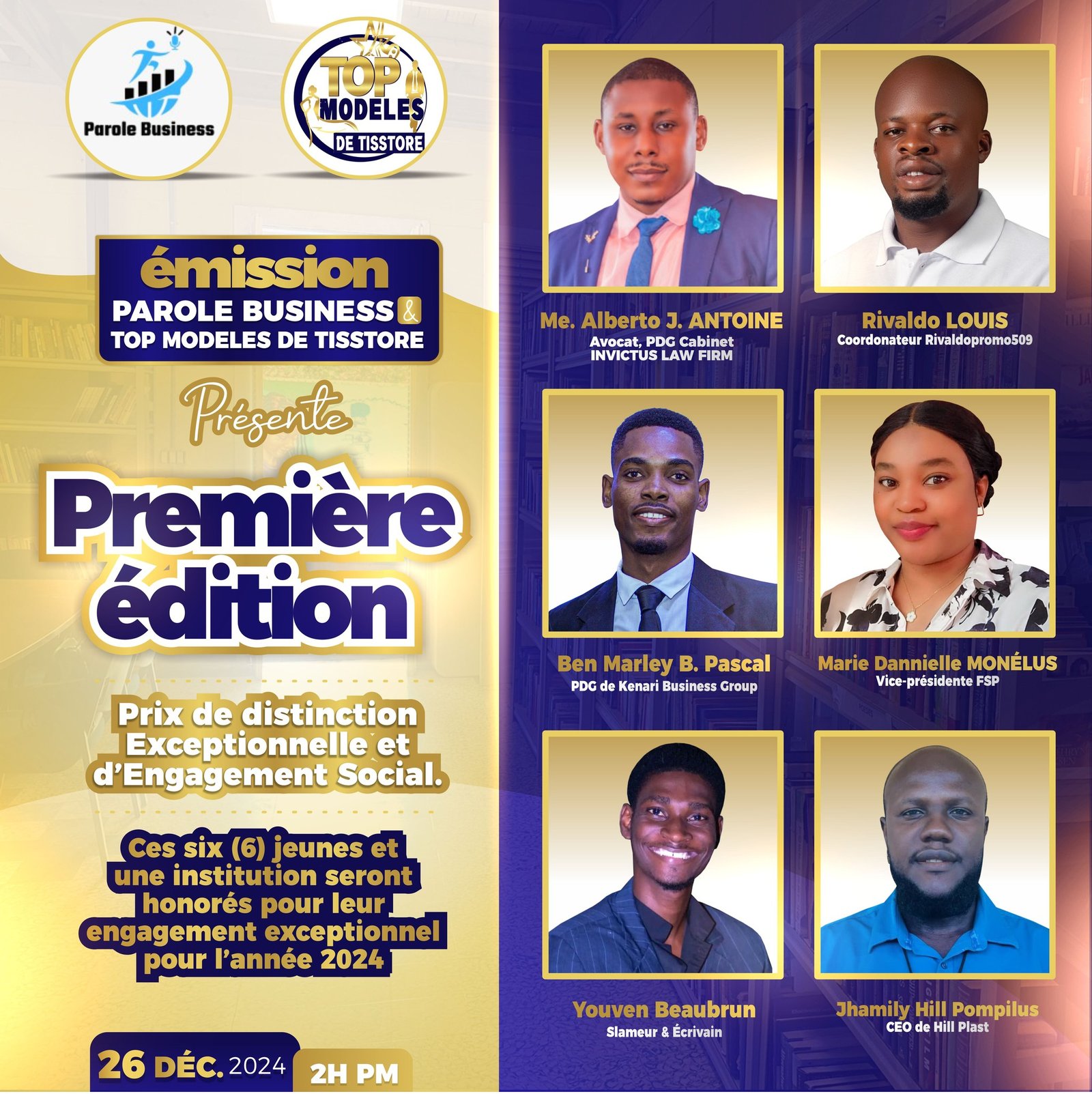 Chaque année, le Concours Top Modèles de Tisstore établit un partenariat avec l’Émission Parole Business, qui participe activement à la mise en avant des jeunes engagés. Lors de la grande finale du concours, 7 jeunes et une institution sont honorés pour leur impact social et leur engagement dans la communauté.